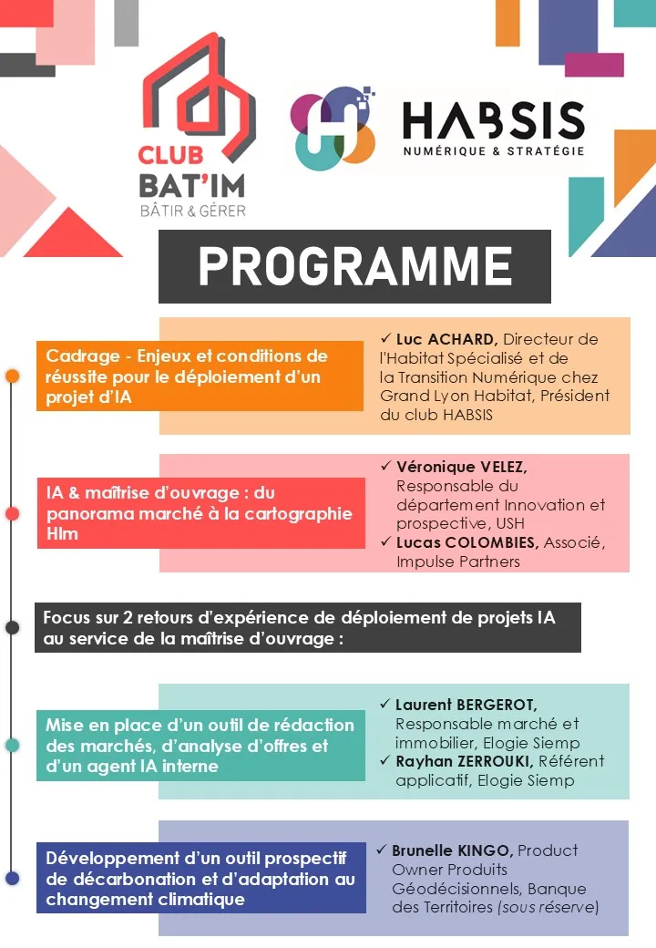 Les clubs BAT'IM et HABSIS vous proposent de décrypter ces enjeux et partager des retours d’expérience autour des usages émergents de l’IA dans la maîtrise d’ouvrage.